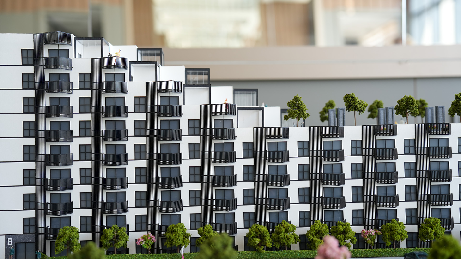 Ozan Bulvar’ın L planlı konut bloğu; çatı katlarındaki kontrollü geri çekilmelerle derinlik kazanan, koyu düşey hatlarla vurgulanan açık cepheleri ve üçgen formlu ritmik balkonlarıyla benzersiz bir estetik sunuyor.
