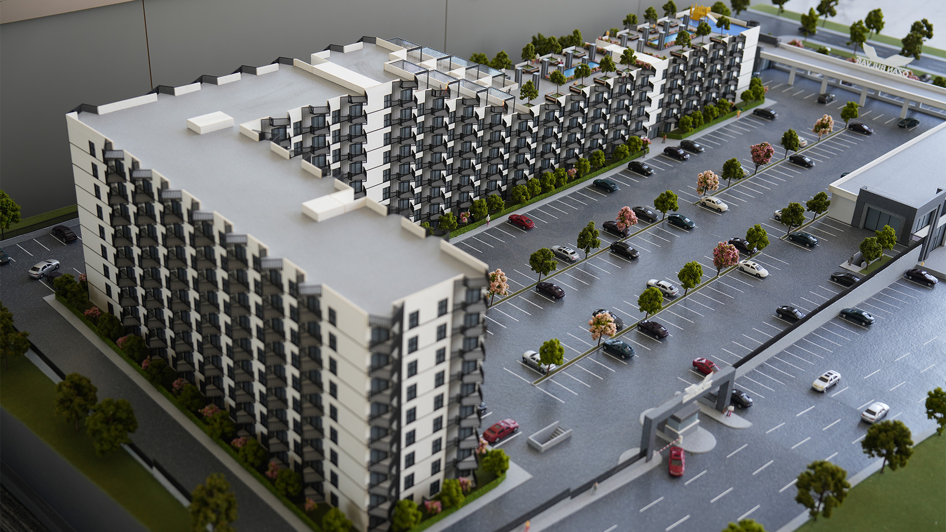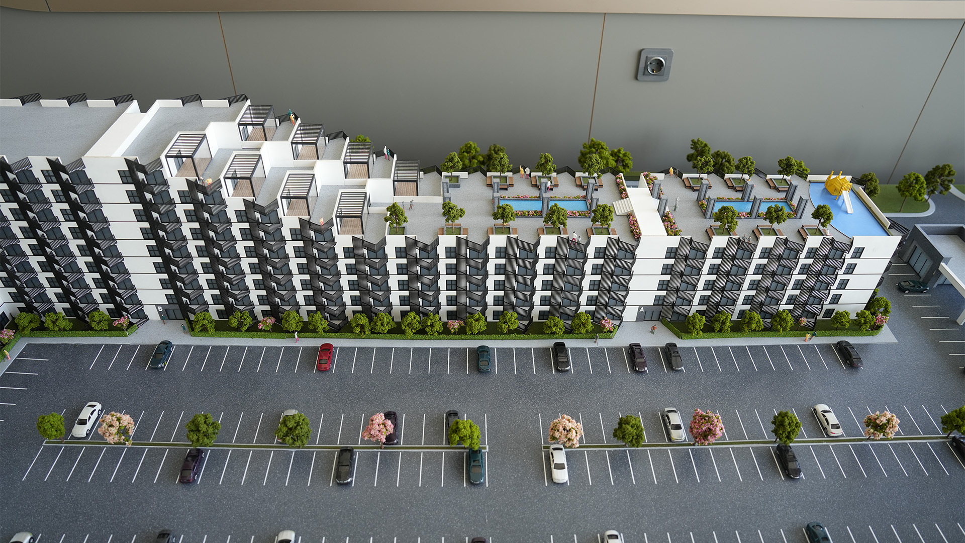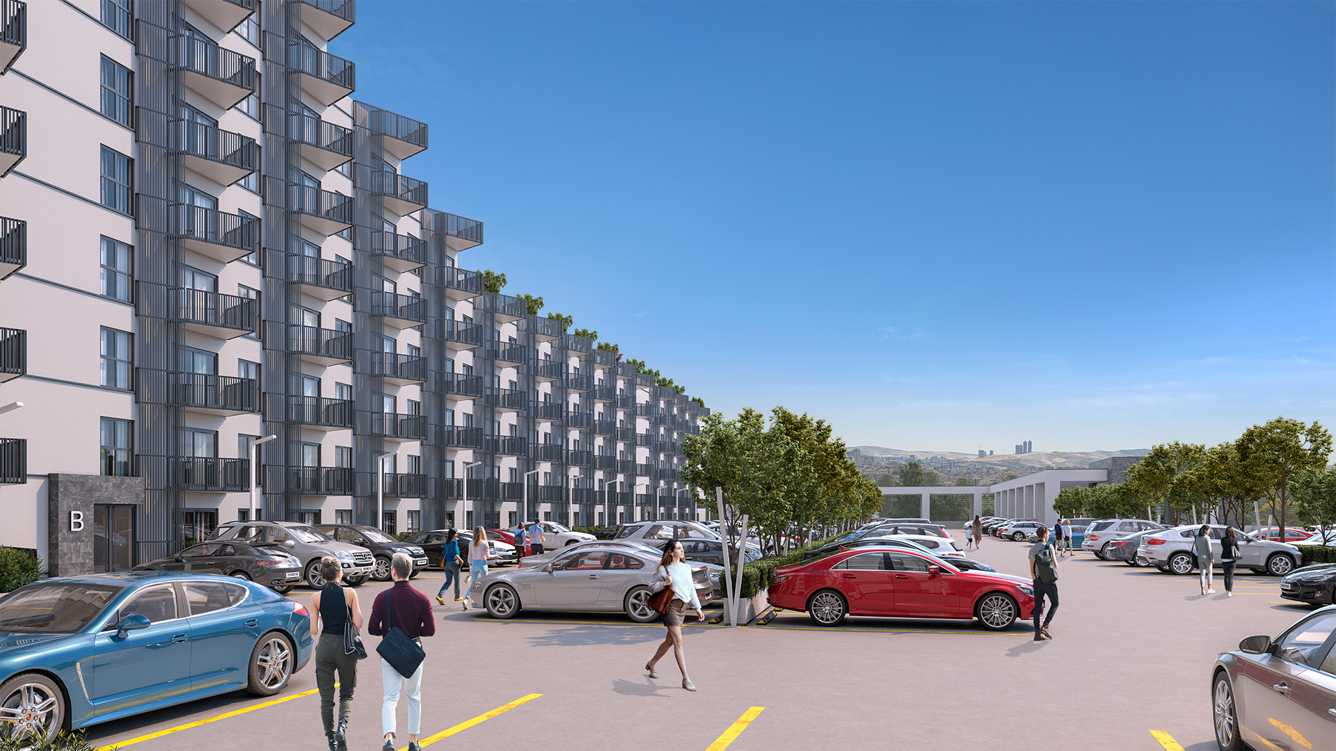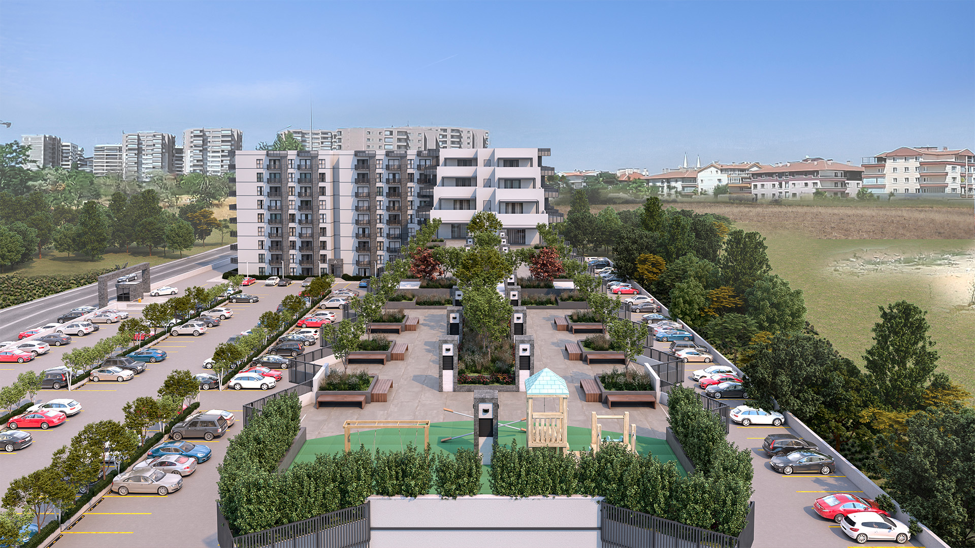 Zemin katı otopark olarak planlarken, çatı katında yürüyüş yolları, oturma alanları ve özel çocuk parkı ile ferah, güvenli ve keyifli bir sosyal kat yarattık.