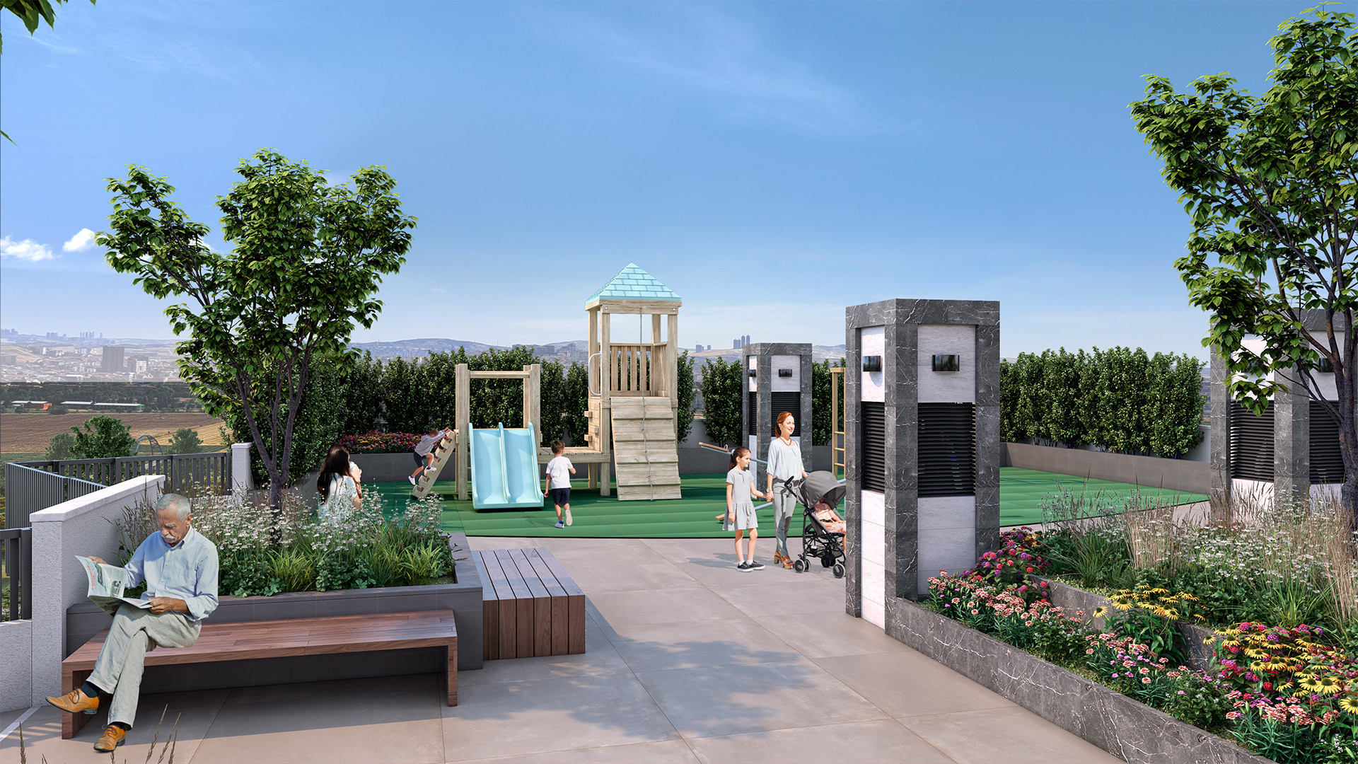 Çatı katında tasarlanan yürüyüş yolları, dinlenme alanları ve çocuk parkı ile sosyal yaşam gökyüzüne taşınıyor.